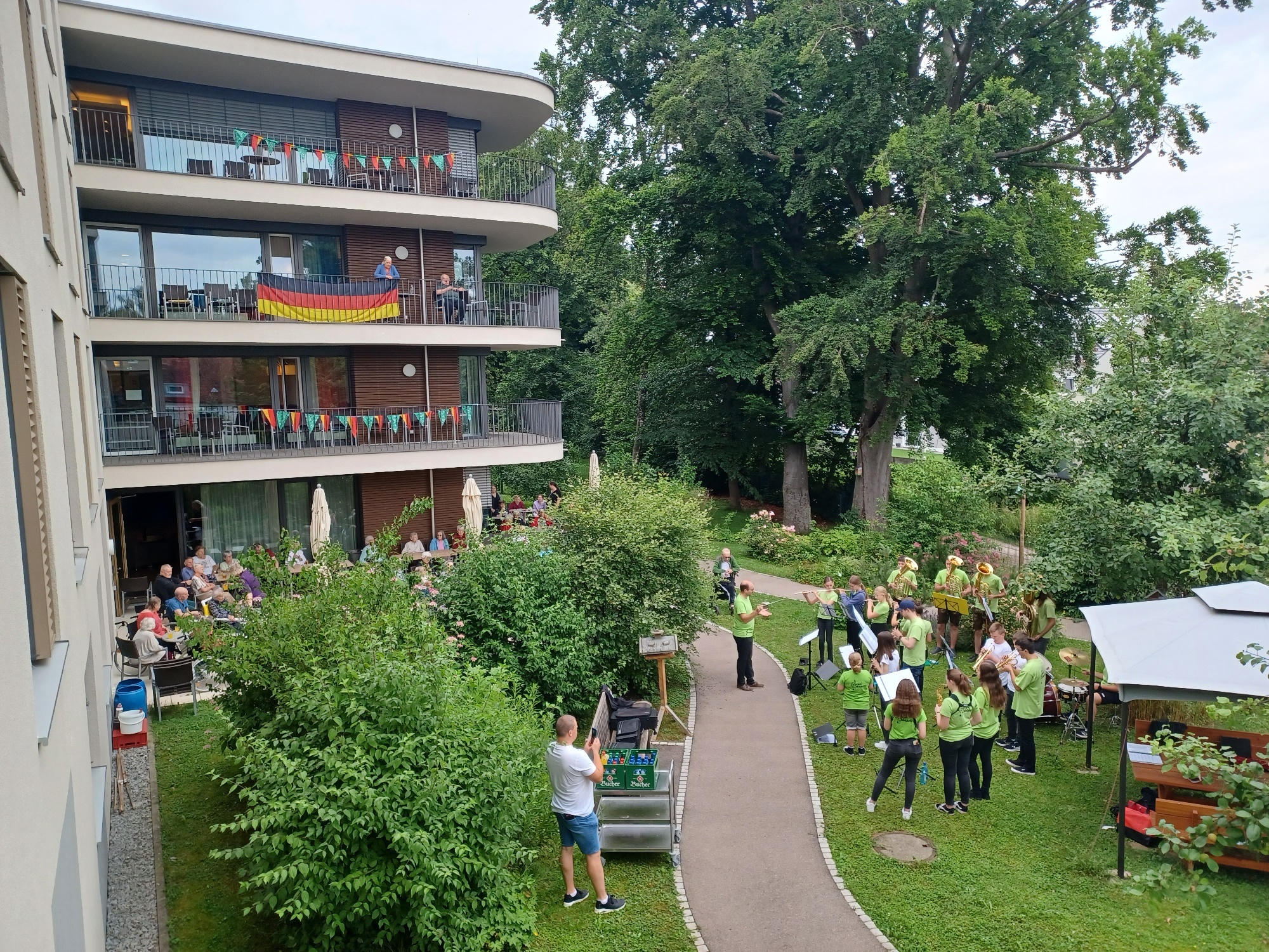 ... am 30.06.2024 hat die Jugendkappelle Siebnach/Ettringen das erste Konzert für unsere Bewohner gespielt. Dabei wurde eine bunte Auswahl von traditionellen und modernen Musikstücken dargeboten. Petrus war gnädig und so konnte das Konzert bei trockenem Wetter in unserem Garten stattfinden. Fast alle Bewohner unseres Hauses haben sich im Garten, auf den Balkonen oder den Logenplätzen in ihren Zimmern eingefunden und dem musikalischen Ohrenschmaus gelauscht. Wir danken den Musikern für dieses tolle Ereigniss. In den kommenden Wochen stehen noch weitere Konzerte an. Die Musiker freuen sich hier jederzeit auch über "Zaun- und Gartengäste" aus Schwabmünchen - und wir als Senionrenheim auch. Wir möchten ein Ort der Begegnung sein. Falls Sie den musikalischen Klängen lauschen wollen sind Sie jederzeit herzlich willkommen, Getränke stehen zur Verfügung. An dieser Stelle bedanken wir uns bereits herzlich bei der Stadt Schwabmünche und bei der Sparkasse Schwaben Bodensee, die über das Programm "100 Stunden Musik" die Konzerte ermöglicht. Weitere Termine sind: